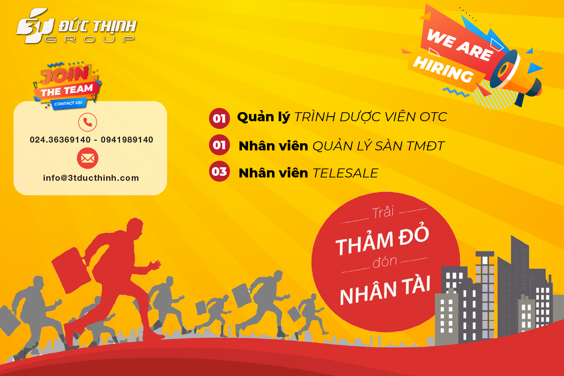 Do mở rộng quy mô và lĩnh vực kinh doanh, Tập đoàn 3T – Đức Thịnh Group cần chiêu mộ nhân tài đi làm ngay với các vị trí sau: